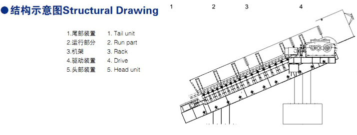 1.尾部裝置 2.運行部分 3.機架 4.驅動裝置 5.頭部裝置